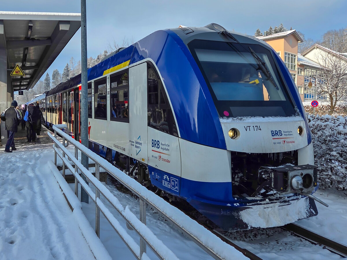 VT 174 der BRB steht im Bahnhof Füssen mit der RB 68 nach München Hbf neben dem für diesen Sonntag pausierenden VT 324, 11.01.2026.