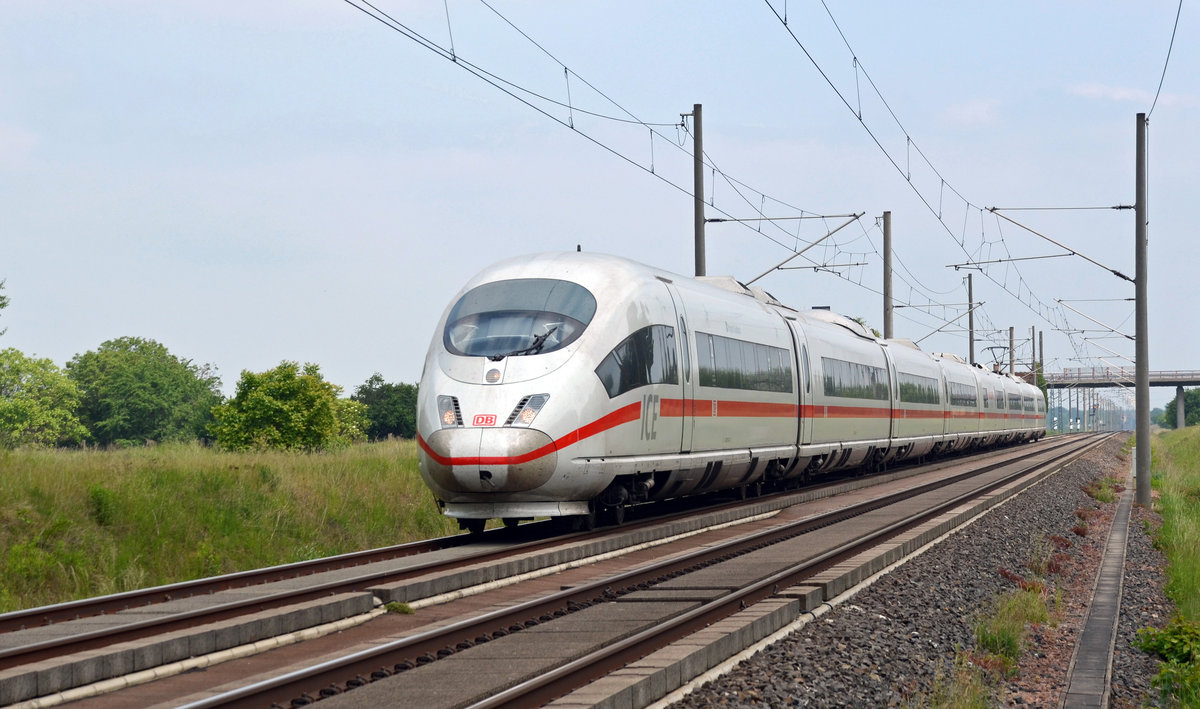 Der planmäßig mit einem Triebzug der Reihe 403 gefahrene Sprinter-ICE 1005 durcheilt am 19.05.18 auf dem Weg nach München soeben Brehna. Fotografiert vom Bahnsteigende! Martin Schneider
