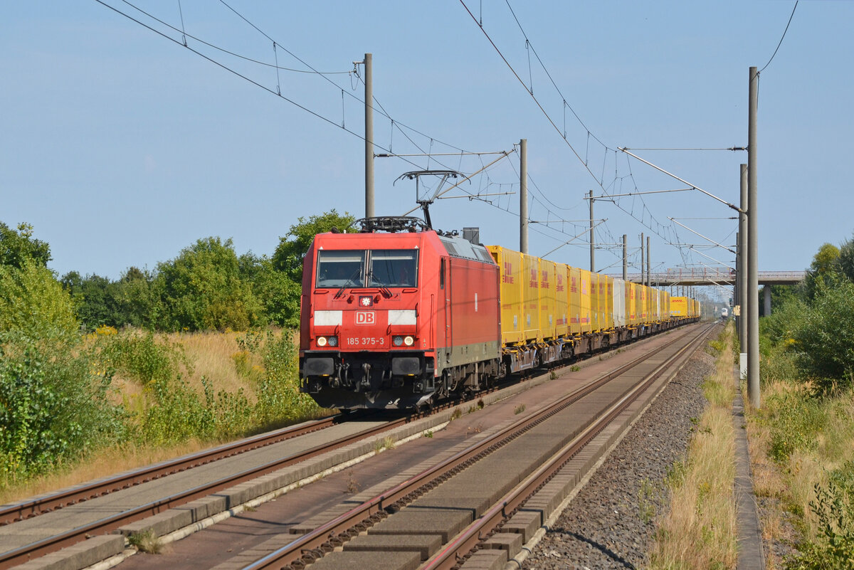 Mit dem DHL-Containerzug von Großbeeren nach Frankfurt(M) rollt 185 375 am 01.09.24 durch Brehna Richtung Halle(S). Fotografiert vom Bahnsteigende. Martin Schneider
