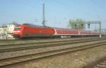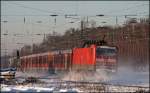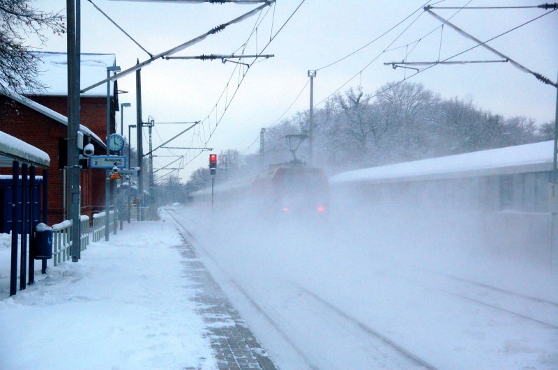 Das war ein Schneegestöber: Eine unbekannte Lok der BR 101 schiebt einen IC von Berlin kommend nach Leipzig Hbf, hier bei der Durchfahrt in Burgkemnitz.