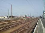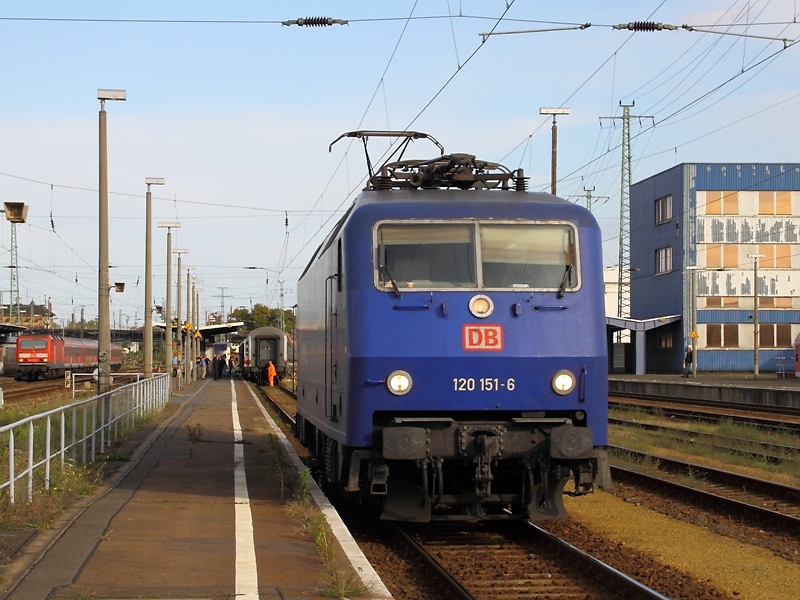 ZDF-Lok 120 151-6 setzt sich am 5.10.2009 in Cottbus vor den EC 340 nach Hamburg-Altona.
