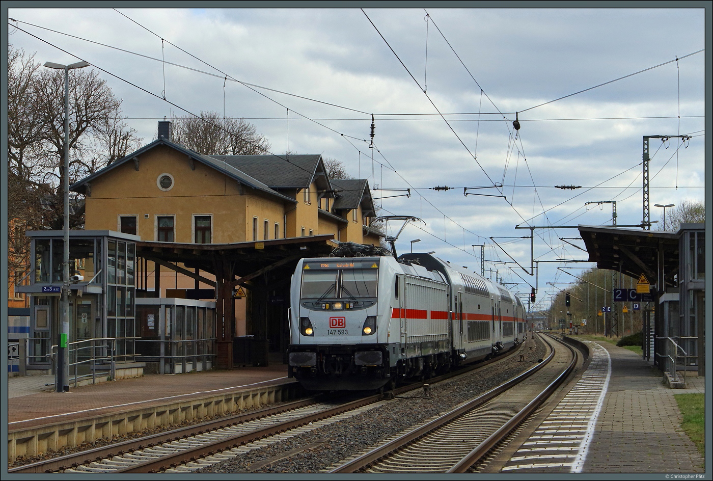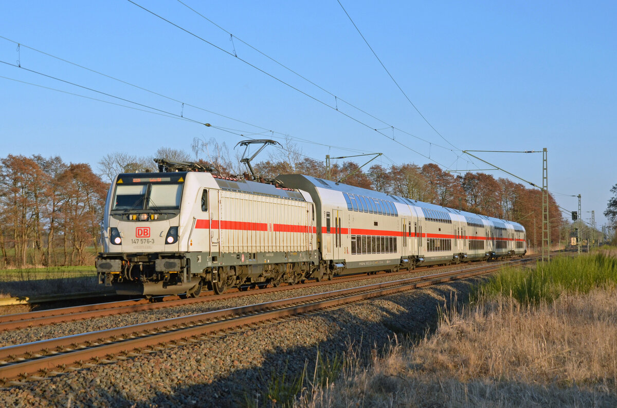 DB 147 580-5 schiebt am 09.07.2023 den Ersatz-IC 2916 von Nürnberg nach Karlsruhe in Crailsheim von Gleis 2 weiter nach Stuttgart.