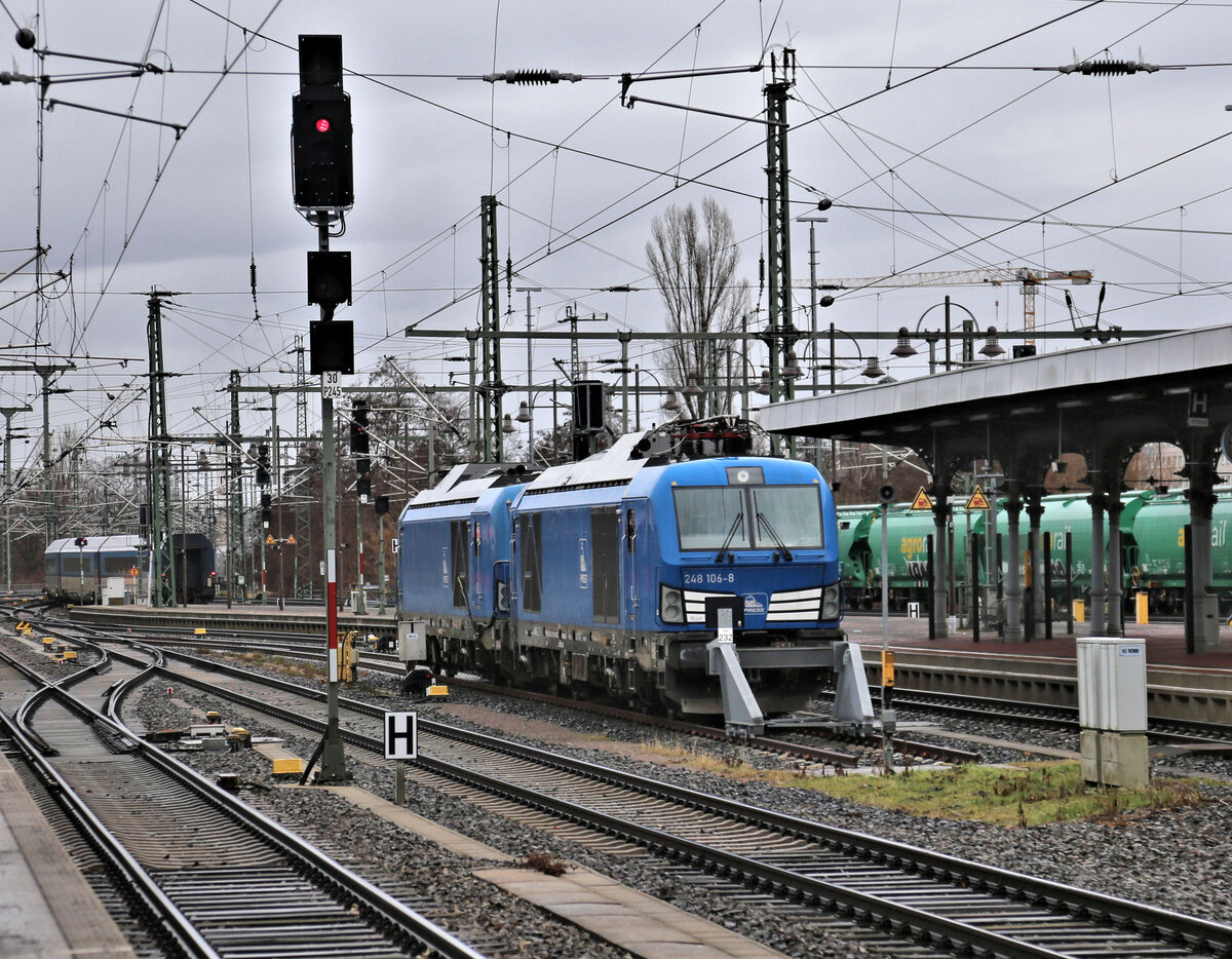 Im Dresdener HBF standen am 22.2.2026 um 11.30 Uhr zwei Press Lokomotiven der Reihe 248. Vor dem Prellbock war vom Bahnsteig aus die 248106-8 zu erkennen. Gerd Hahn