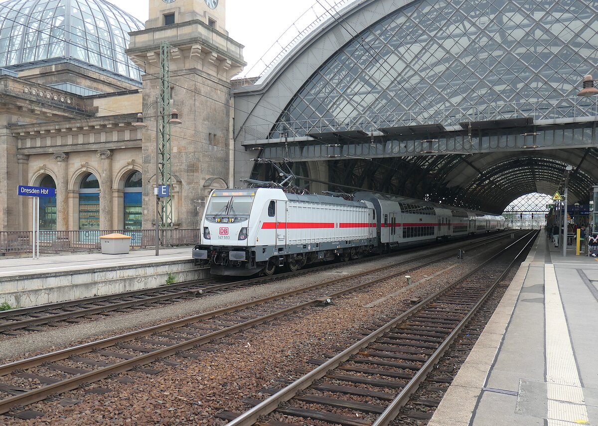 Die 182.513, an die Baureihe hat man ja in Dresden noch gute Erinnerungen auf der S1, mal mit guter Perspektive aufgenommen in Dresden HBf im November 2025. Rainer Haufe