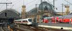 Es findet, wenn überhaupt, alles nur auf der Dresden-Hauptbahnhof-Westseite statt, Zugkreuzungen en Masse sind vorprogrammiert: Trailerzug mit 193 136 von DRAILL im Februar 2026