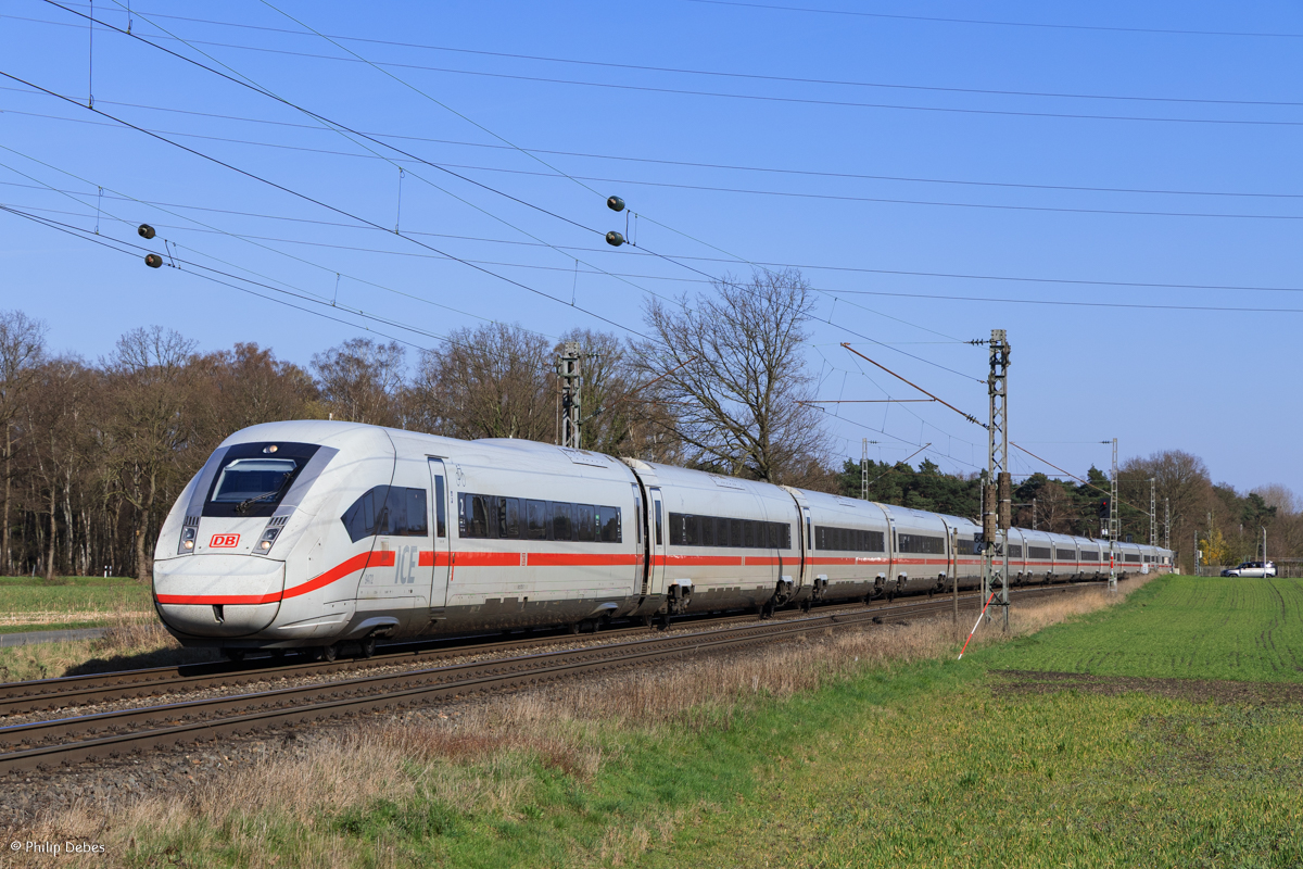 402 026-9  Tz 226 - Lutherstadt Wittenberg  und 402 039-2  Tz 239 - Essen  als ICE 640 Richtung Köln Hbf, auf Grund einer Signalstörung zwischen Hamm und Kamen, hier umgeleitet in Hamm Pelkum, 18. März 2026