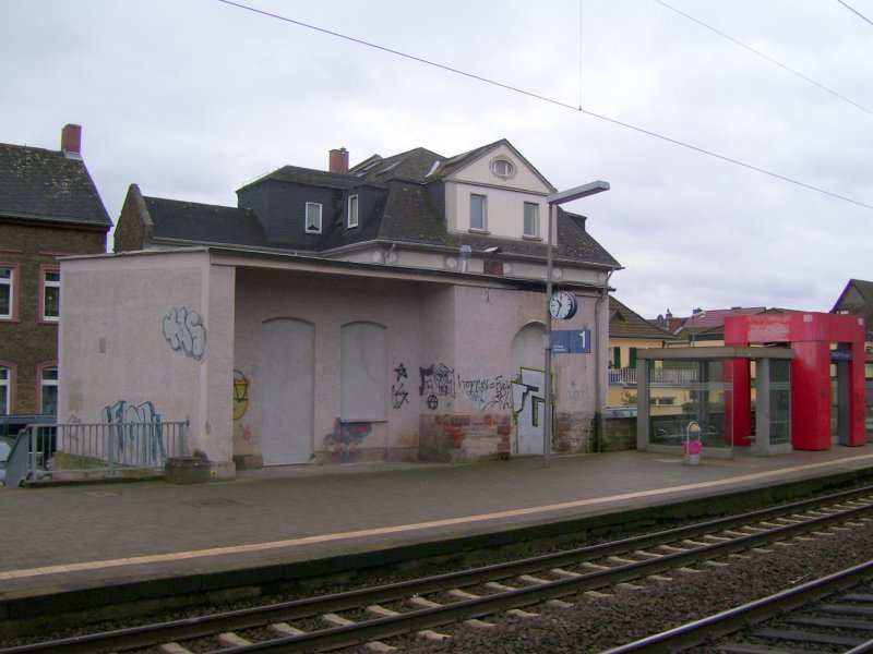 Die Bahnsteige in Erbach (Rhg). Die Gleise gehören zur KBS 466. Auf dem linken Gleis fahren die Züge in Richtung Koblenz, auf dem rechten Gleis in Richtung Wiesbaden; 18.07.2012