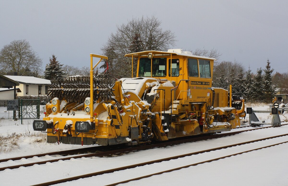Für Gleisbauarbeiten im Bahnhof Aschersleben hielten sich die Universal-Stopfmaschine Plasser & Theurer Unimat 08-475 4S (99 80 9424 033-5 D-JT) sowie die Schotterplanier- und Profilierungsmaschine Plasser & Theurer SSP 110 SW (99 80 9425 034-2 D-JT) am Wasserturm bereit.