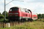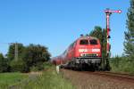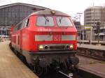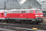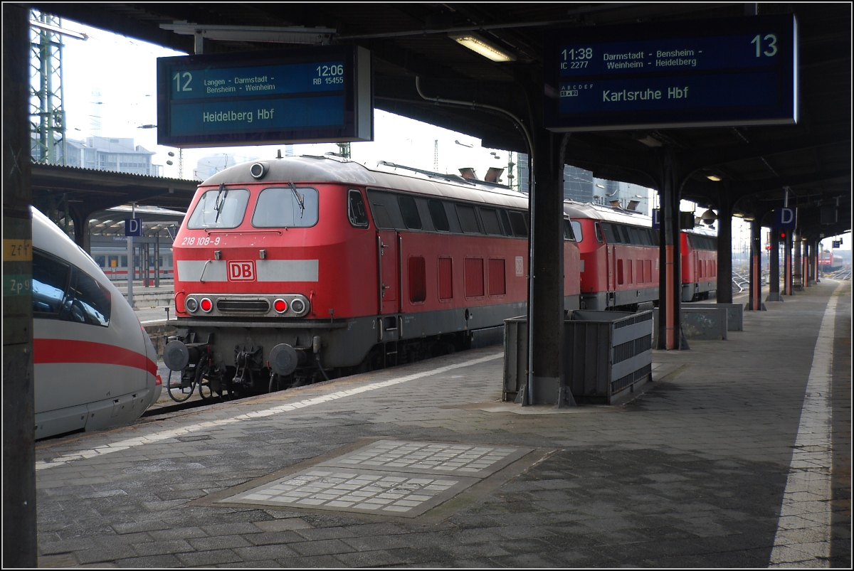 Dreierpack 218 102-2, 218 103-0 und 218 108-9 mit laufenden Motoren vor einem Haubentaucher (23.12.2008 11:40). Mit zusammen 8100 PS können sie es schon fast mit dem ICE aufnehmen. Aber von wegen abgasoptimiert. Die Wolke, die kurz zurvor das Stellwerk einnebelte, erinnerte mehr an eine Dampflok denn an Diesellokomotiven.