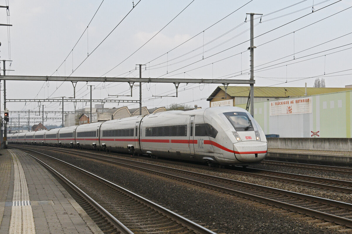 Überraschung im Friedrichshafener Stadtbahnhof (|||) - ICE 9204 bei der Ausfahrt in Richtung Ulm am 29.03.2023. Ab Juni 2023 sollen ICE 4 die bisher lokbespannten österreichischen Züge des IC 118/119 "BODENSEE" zwischen Innsbruck und Dortmund ersetzen. Laut Informationen im Netz wurden bei dieser Fahrt die Bahnsteige an den Stationen der Südbahn, Bodenseegürtelbahn und Arlbergbahn untersucht und bewertet.