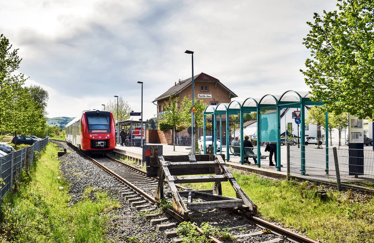 Uerdinger Schienenbuszug der DB-Nebenbahn Weinheim-Fürth vor dem Bahnhof Fürth, einem hübschen hessischen Einheitsbahnhof. Die Gleisanlagen sind hier 2024 so weit zurück gebaut, dass die Bahn nur noch ein Schatten ihrer selbst ist (Datum unbekannt) Frank Nowotny