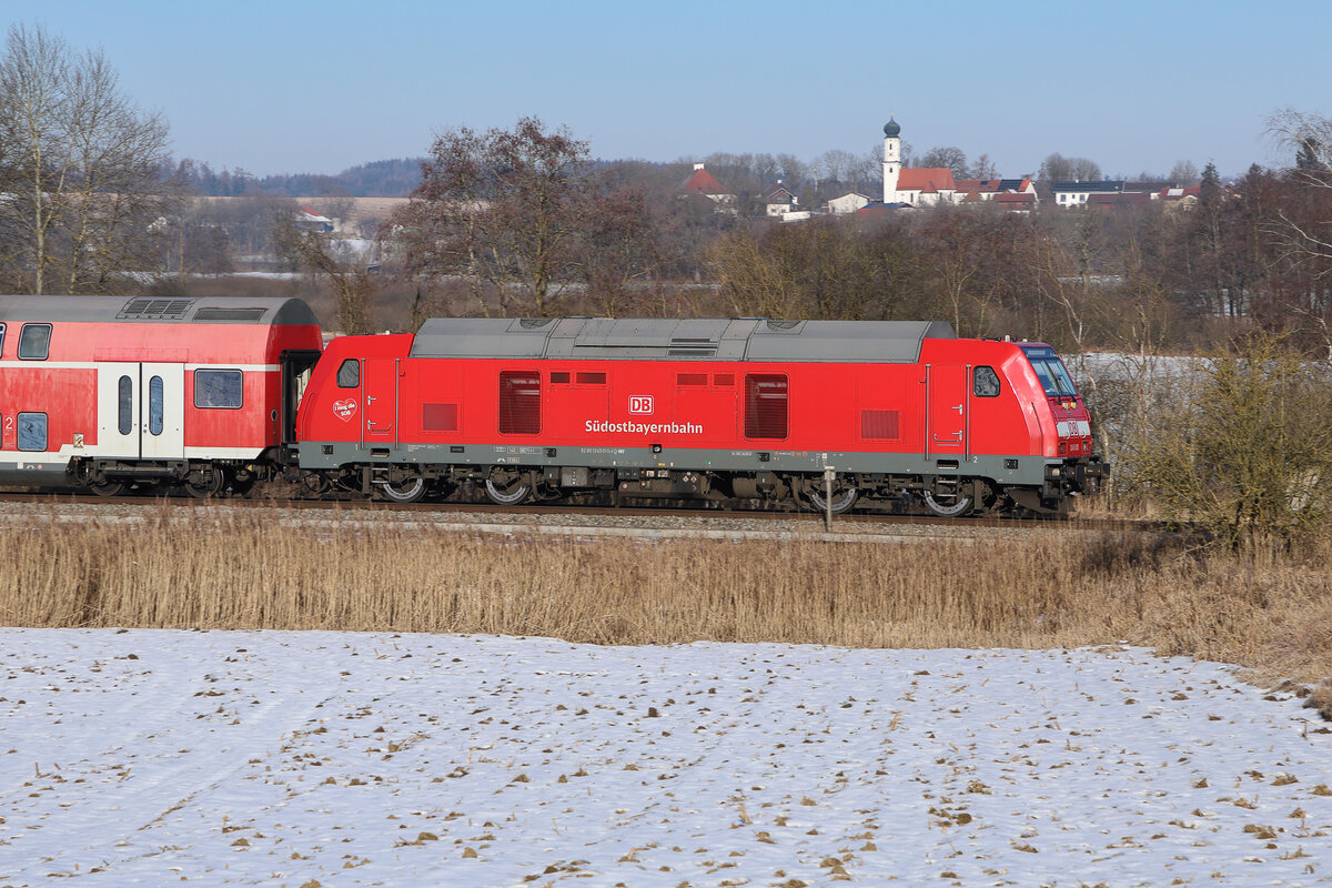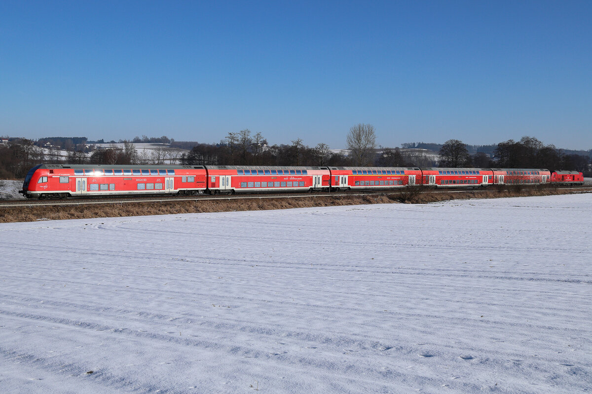 Eine DB Garnitur auf freier Strecke am 20.01.2026 bei Weidenbach. Es hat zwar schon lange nicht mehr geschneit, aber es ist so kalt, das hier noch eine durchgängige Schneefläche liegt. Flo Weiss