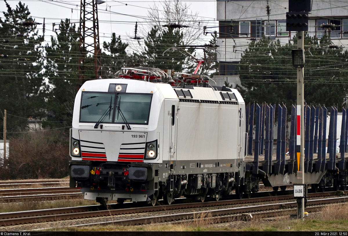 Die noch weiße 193 961-0 durchfährt mit Rundholz den Bahnhof Großkorbetha auf Gleis 5 Richtung Halle-Ammendorf.