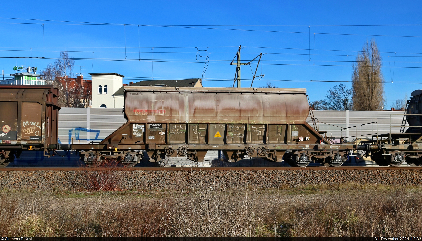 Vierachsiger Schüttgutwagen mit der Bezeichnung "Taoos" (37 80 0693 277-6 D-VTGCH), eingereiht in einem EZ mit 185 054-4 und fotografiert bei der Vorbeifahrt an Halle(Saale)Hbf von Bahnsteig 12/13. Auf dem Wagen steht mit Kreide angeschrieben: "Letzter Wagen mit DB Cargo. 23.12.24. Wünschendorf–Zeitz–Brandenburg. time to say goodbye" 🧰 VTG GmbH 🕓 31.12.2024 | 12:33 Uhr