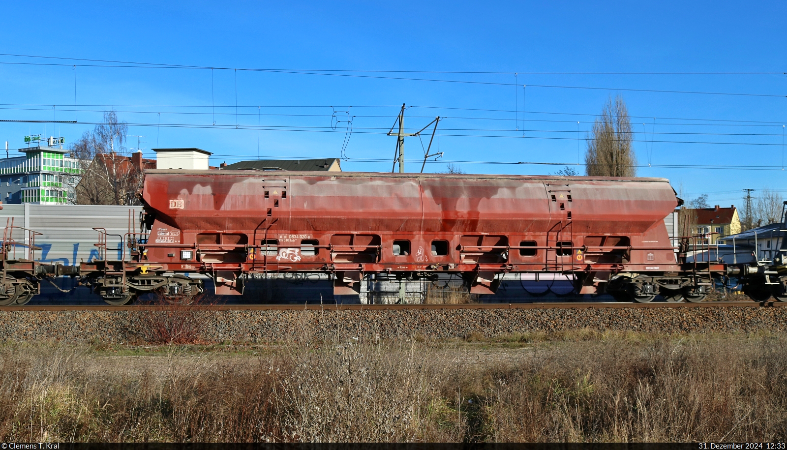 Vierachsiger Schüttgutwagen mit dosierbarer Schwerkraftentladung und der Bezeichnung "Tads960" (31 80 0834 020-6 D-DB), eingereiht in einem EZ mit 185 054-4 und fotografiert bei der Vorbeifahrt an Halle(Saale)Hbf von Bahnsteig 12/13. 🧰 DB Cargo 🕓 31.12.2024 | 12:33 Uhr