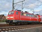 Großraumwagen der Bauart UIC-X (DB) mit der Bezeichnung "WGm 038.8" (56 80 89-90 010-0 D-EURO), eingereiht in einem Partyzug mit 111 121-0, der den Endbahnhof Halle(Saale)Hbf auf Gleis 7 verlässt und in die Abstellung nach Halle-Nietleben geht.