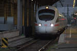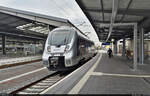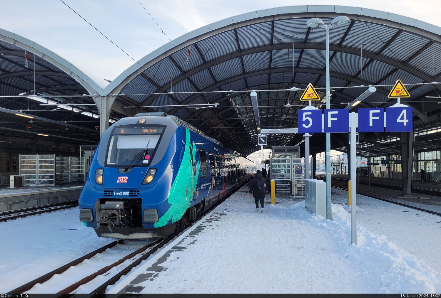 Mit seiner blauen Folierung hebt sich 1442 808 (Bombardier Talent 2) von seinen silbernen Artgenossen merklich ab. Er wirbt seit vergangenem Sommer für Bahnberufe in der Region. Eines winterlichen Nachmittages zu Jahresbeginn schaute er auch einmal in Halle(Saale)Hbf vorbei und wurde an Gleis 5 unmittelbar vor der Abfahrt beiläufig verewigt.