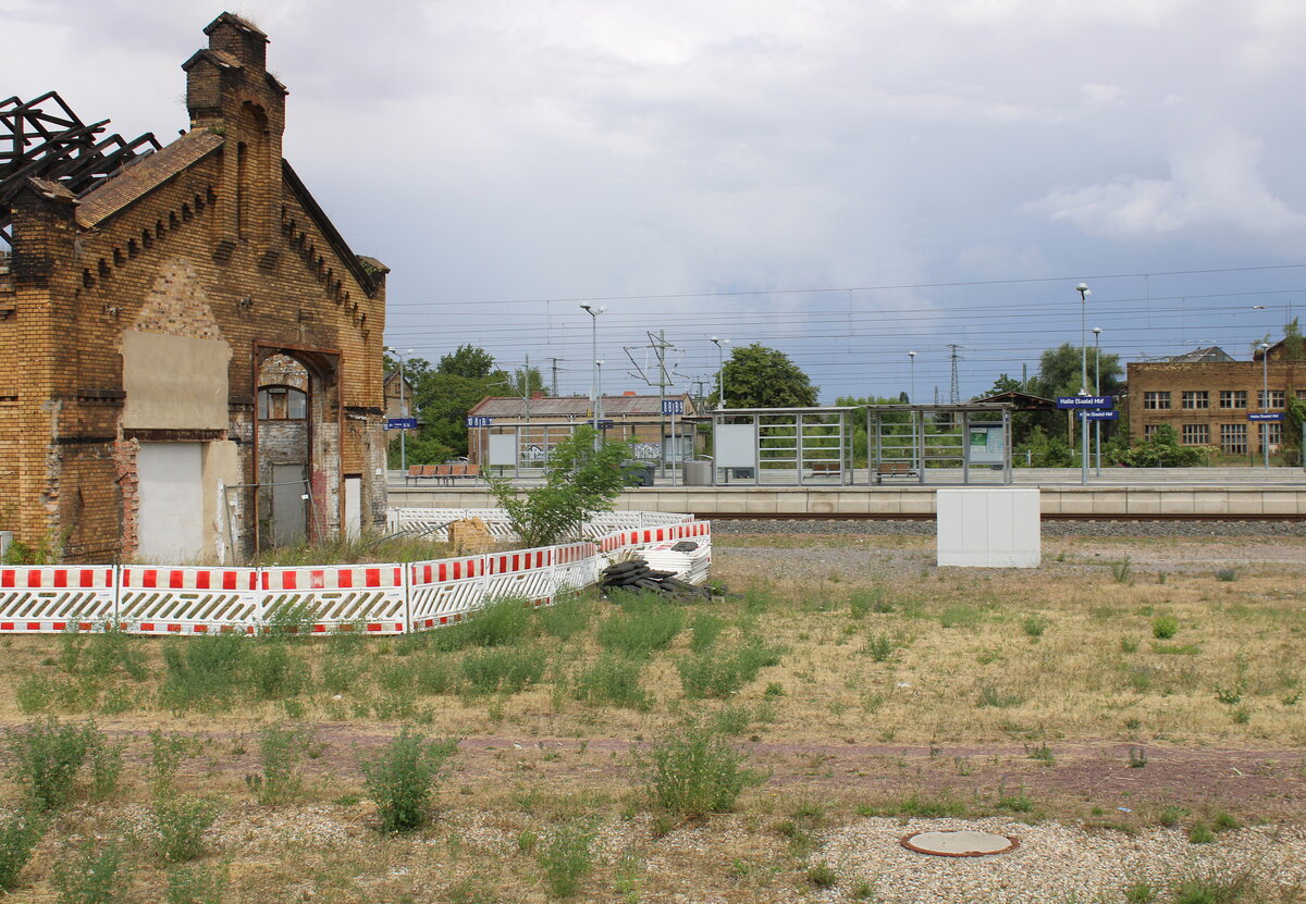 Vierachsiger Schüttgutwagen mit dosierbarer Schwerkraftentladung und der Bezeichnung  Tads<sup>960</sup>  (31 80 0834 020-6 D-DB), eingereiht in einem EZ mit 185 054-4 und fotografiert bei der Vorbeifahrt an Halle(Saale)Hbf von Bahnsteig 12/13.