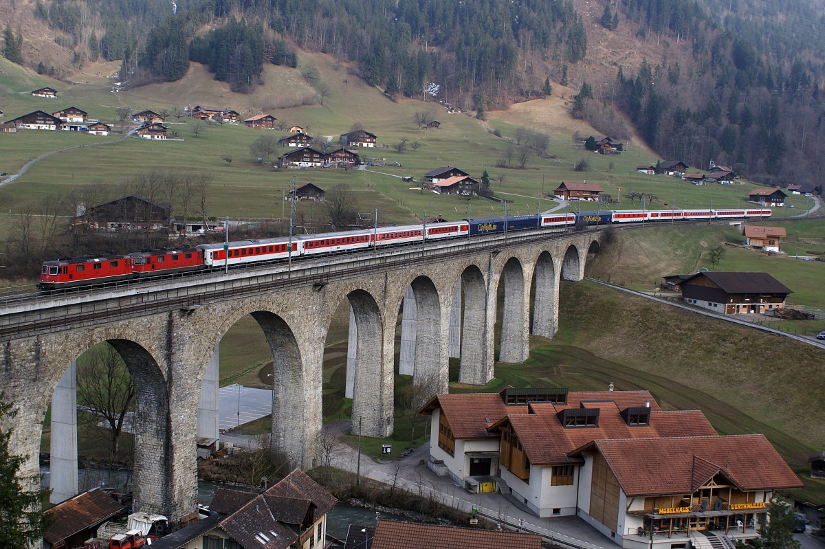 SBB/CNL: Der CNL Brig-Hamburg HBF-Amsterdam "KOMET" verkehrte in den Jahren 2008/2009 vom 27. Dezember bis zum 18. April nur an Samstagen bis und ab Brig. Während der Wintersaison 2013/2014 wird die Destination Brig leider nicht mehr angefahren. Am 4. April 2009 konnte der interessante Zug mit einer Doppeltraktion Re 420 und 13 Wagen während seiner letzten Rückfahrt nach Amsterdam auf dem Kanderviadukt der Lötschberg-Nordrampe bei Frutigen verewigt werden.