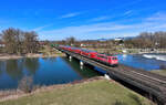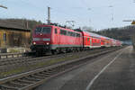 Im August 2023 war die Centralbahn noch mit Ersatzzügen auf der RB49 zwischen Hanau und Gießen unterwegs. Hier erreicht die DB Gebrauchtzug 111 174 "Elfriede" mit zwei Doppelstockwagen Hanau. (30.08.2023)