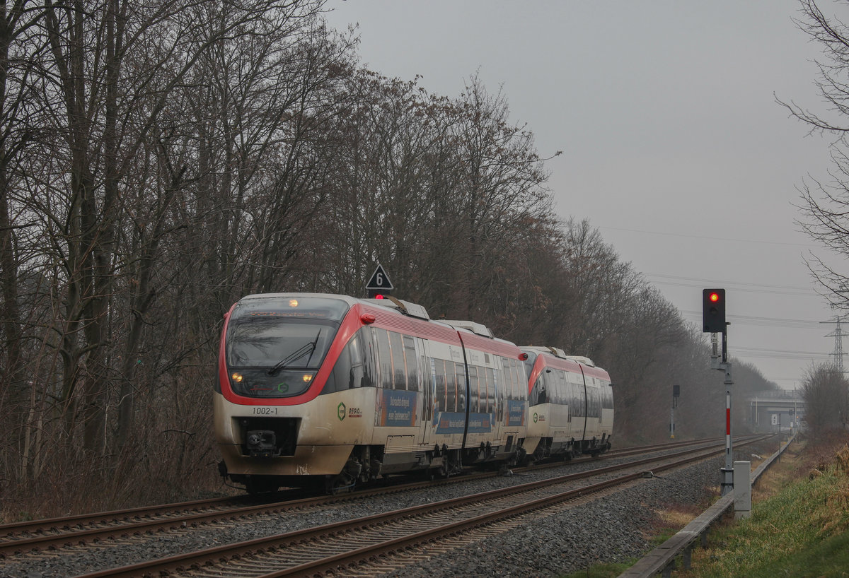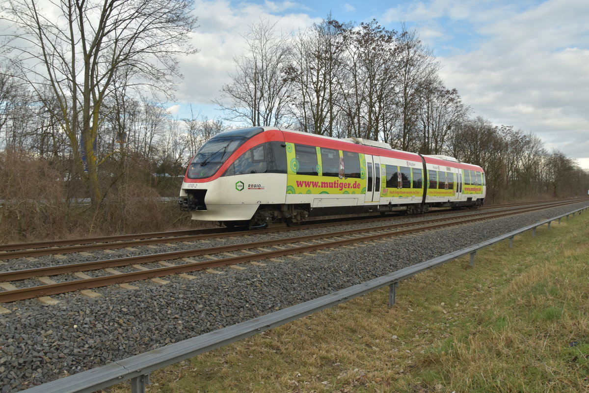 VT 1005 der REGIO-Bahn S28 Kaarst-Mettmann hat gerade den Bahnhof Kaarst-Ikea verlassen und stebt nun Neuss Hbf entgegen. Sonntag 22.2.2015