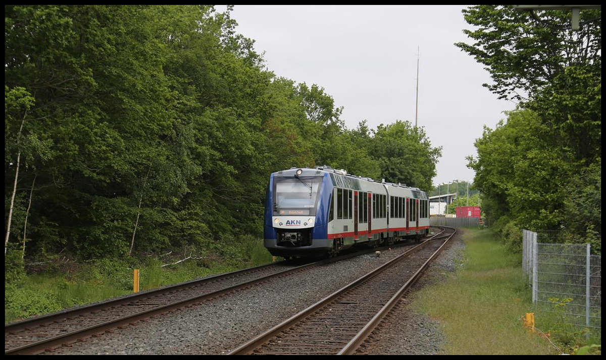Der moderne AKN VT 622656 nach Eidelstedt erreicht hier am 26.5.2020 um 12.04 Uhr den Kreuzungsbahnhof Kaltenkirchen Süd und biegt vom Hauptgleis in das Bahnsteiggleis ab. Gerd Hahn