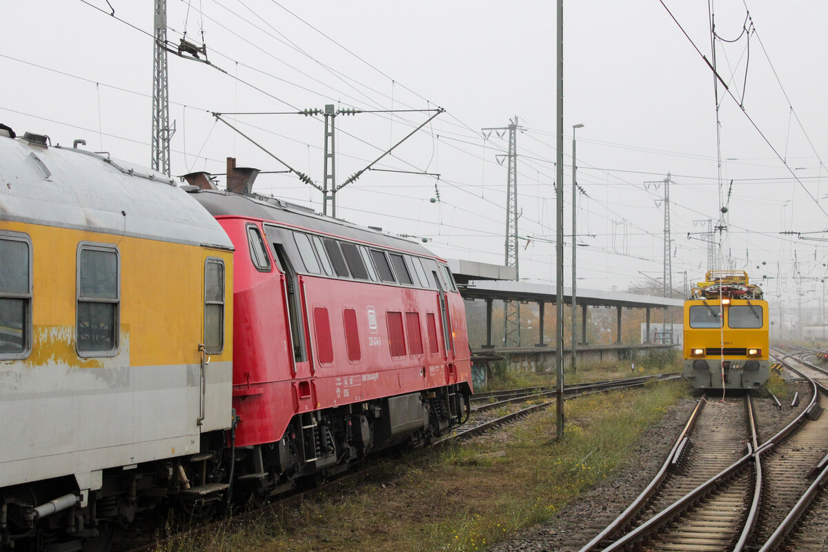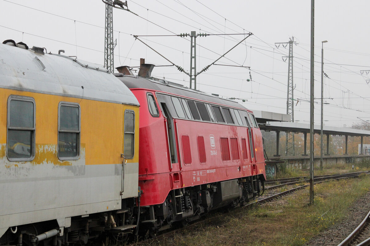 Der Steuerwagen des entgleisten Messzuges. Bei 218 474 ist die Schräglage nach der Entgleisung deutlich zu erkennen. (Karlsruhe, 08.11.2025)