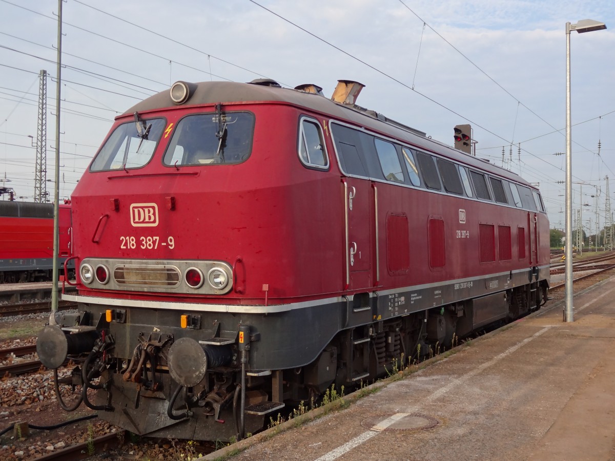 Am 28.9.13 stand die 218 387, welche nach Kempten ausgeliehen ist, im Karlsruher Hauptbahnhof abgestellt. Zuvor kam die Lok über die Rheinbahn angerollt.