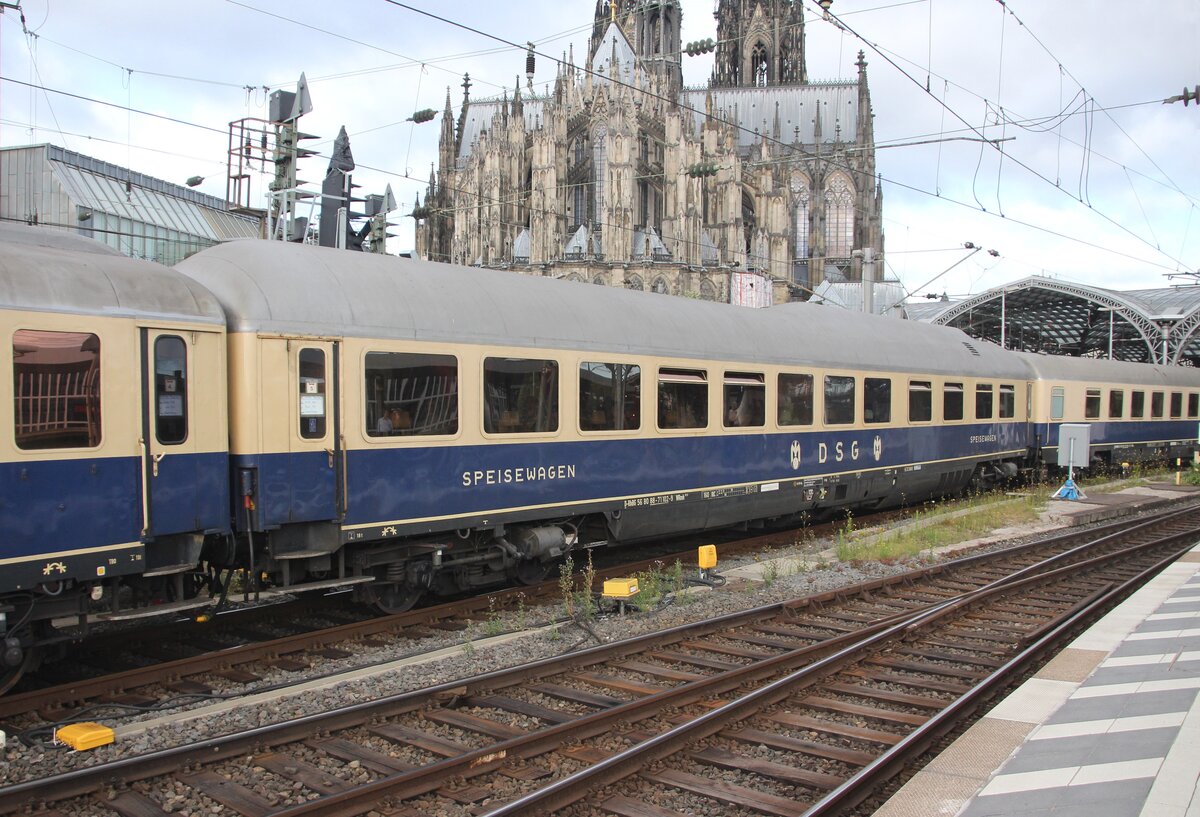 In den Fenstern des AKE-Rheingoldwagens Avmz 56 80 19-94 049-9 D-AKE (1994 049-9) spiegeln sich Bürogebäude der "Messe City" im ehemaligen Barmer Viertel nördlich des Deutzer Bahnhofes.