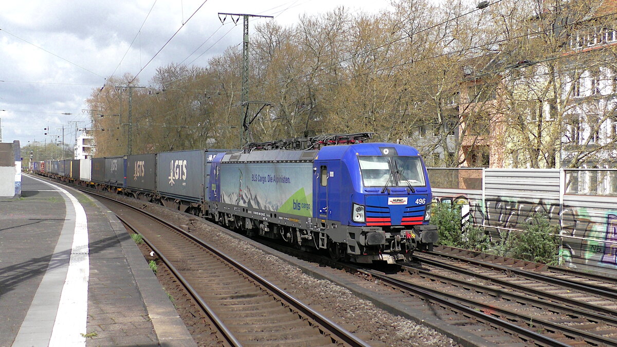 HUPAC 193 469-7 ist am 09.04.2022 für bls cargo mit einem GTS Containerzug unterwegs und passiert hier gerade Köln Süd in Richtung Köln-Einfeltor.