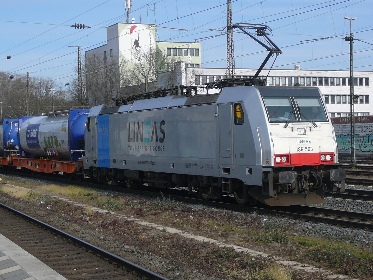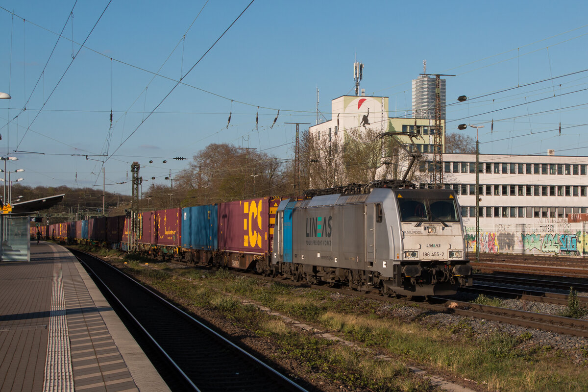 Lineas 186 455-2 mit einem Containerzug am 29.03.2025 in Köln West.