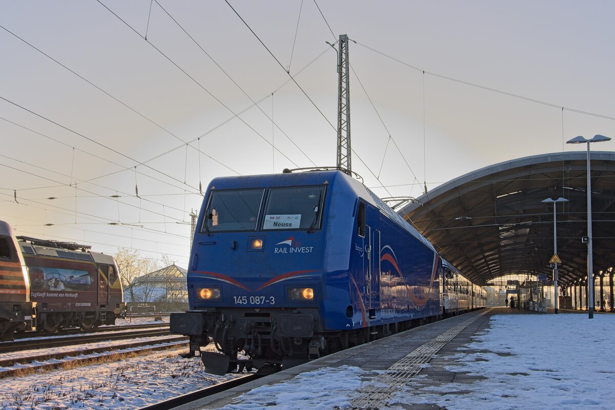 145 087-3 der RailInvest zieht einen Zug der in diesem Jahr durch TRI betriebenen Linie RB 37 aus dem Krefelder Hbf in Richtung Neuss (19.01.2024)