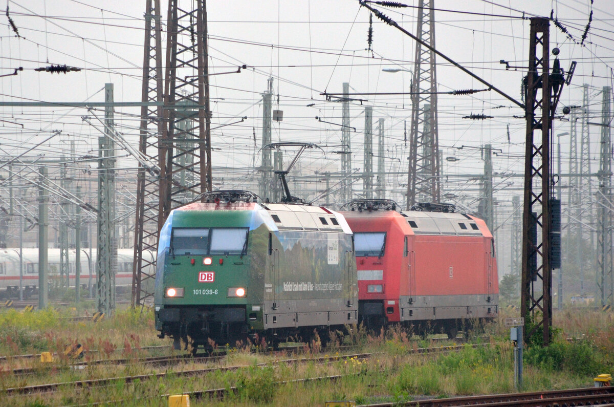 Am Morgen des 25.05.24 wartet die neue Werbelok 101 039 mit einer Schwestermaschine im Vorfeld des Leipziger Hbf auf neue Aufgaben. Sie setzte sich später vor den NJ 409 und brachte diesen nach Berlin.