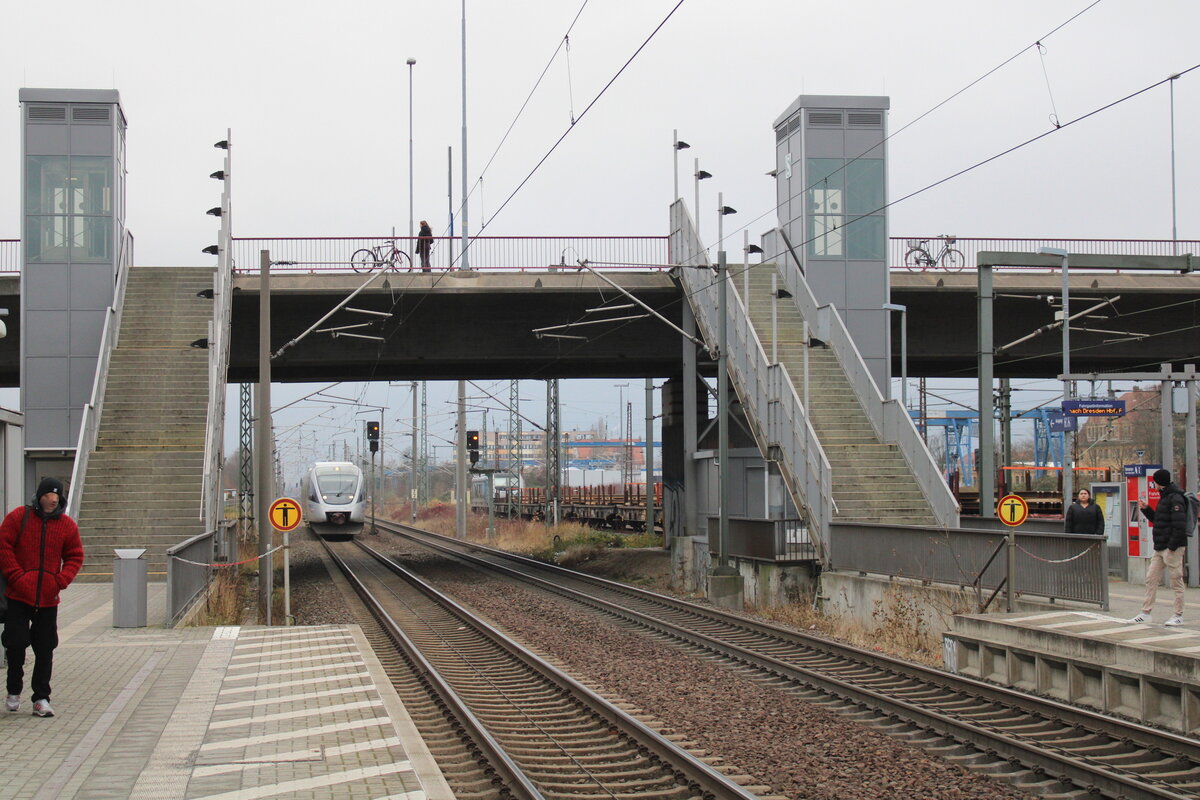 Am frostigen Morgen des 21.11.25 durchfährt der RE6 Leipzig - Chemnitz den S-Bahn-Haltepunkt Leipzig Anger-Crottendorf. Für mehrere Wochen wird der Zug wegen Bauarbeiten zwischen Leipzig und Bad Lausick über den Güterring - Leipzig-Schönefeld -Markkleeberg - Borna - Geithain umgeleitet. Die Fahrzeit verlängert sich dadurch um ca. 45 Minuten, wobei Fahrzeit nicht ganz korrekt ist, denn der Zug steht fahrplanmäßig ganze 18 Minuten in Geithain.