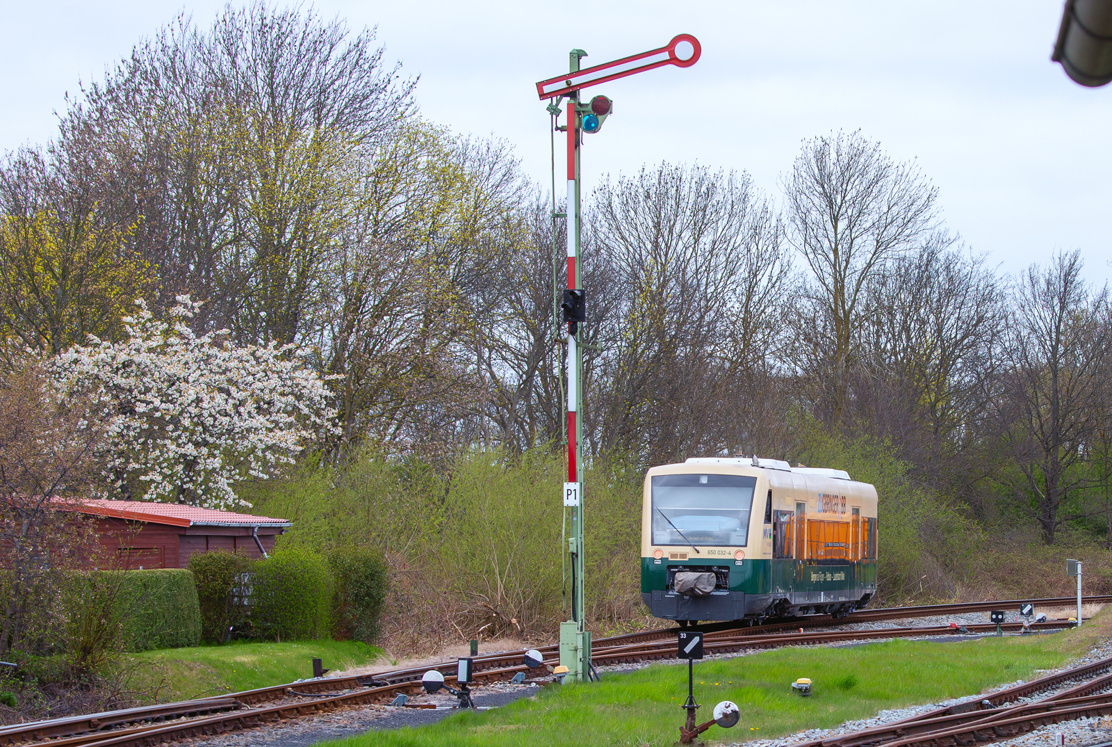 ODEG Regio-Shuttle RS1 in Lietzow ausfahrend nach Sassnitz mit Werbung für den Müritz-Nationalpark und den Naturpark Nossentiner/Schwinzer Heide. - 26.04.2022