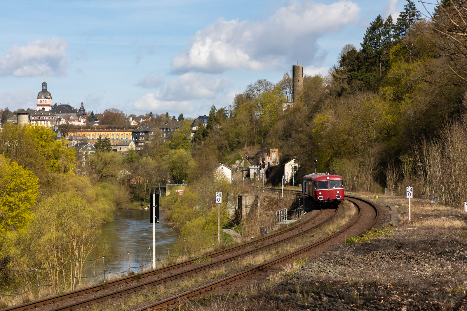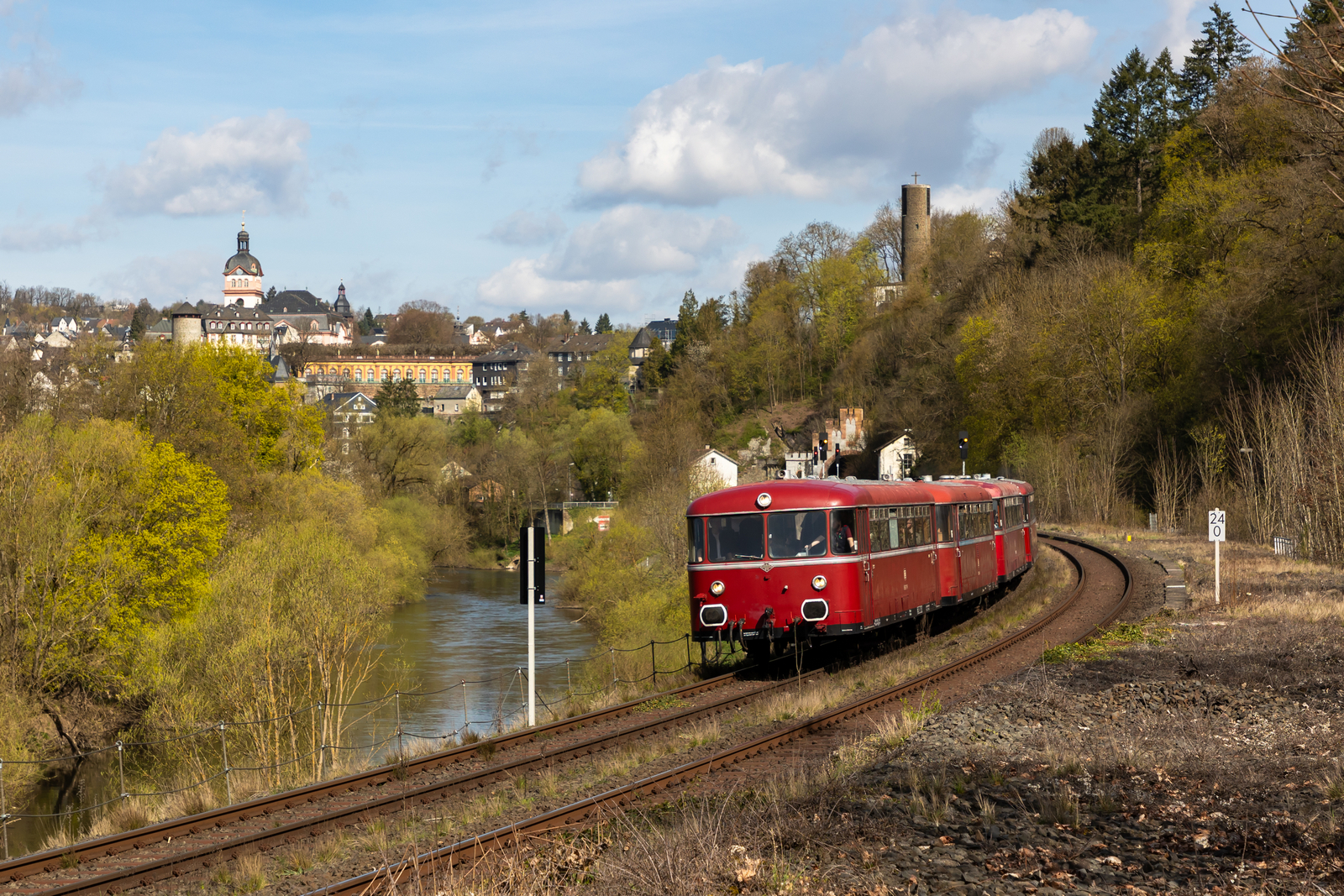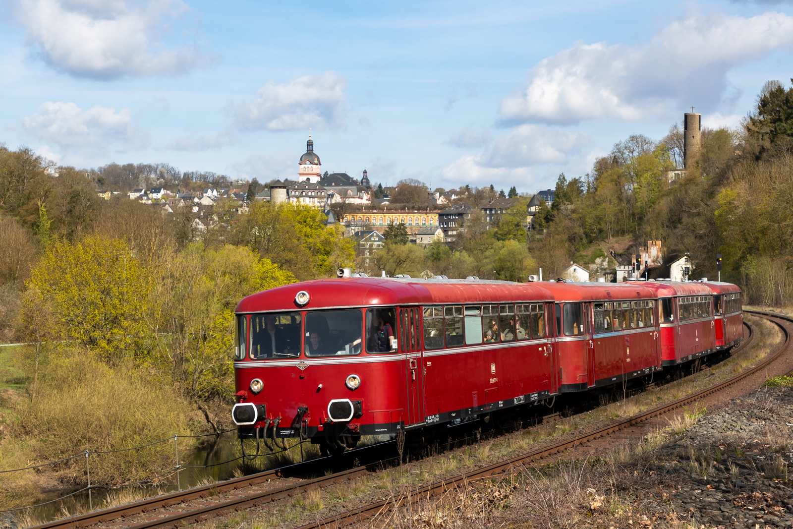Die Oberhessischen Eisenbahnfreunde e.V. aus Gießen mit ihren 4 Schienenbussen (2 mit Motor, 2 ohne Motor) bei ihrer Ostermontagsausfahrt von Gießen nach Limburg. Hinter Weilburg bei der ehemaligen Abzweigung Gensberg Tunnel. 6.4.26