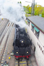 Die DB 218 421-6 und eine weitere sind mit ihrem EC aus München in Lindau HBF eingetroffen, wo eine SBB Re 4/4 II den EC zur Weiterfahrt nach Zürich übernehmen wird.