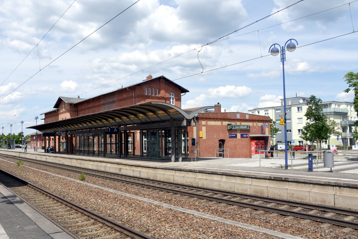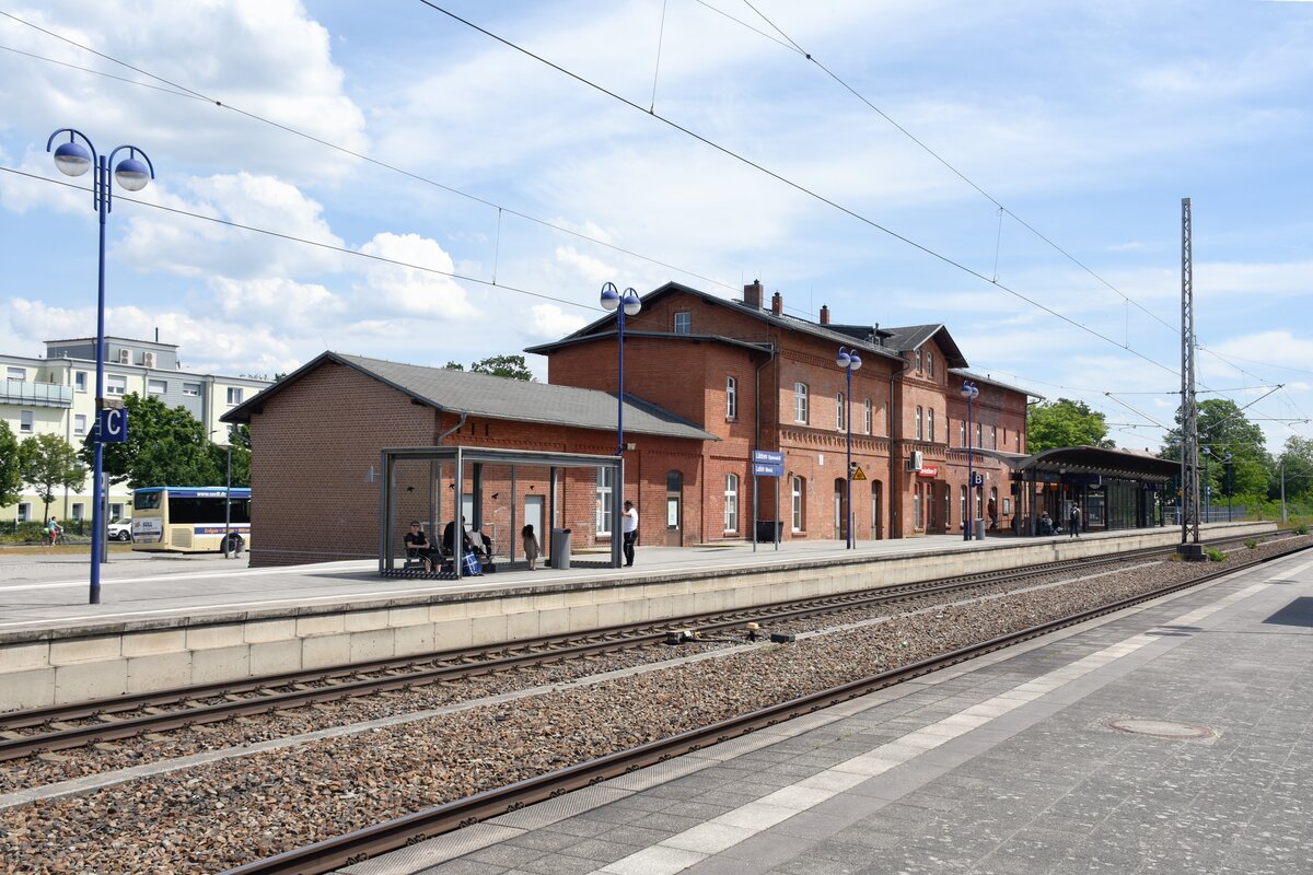 LÜBBEN/Spreewald (Landkreis Dahme-Spreewald), 21.05.2024, Blick vom Bahnsteig auf das Bahnhofsgebäude