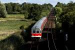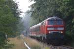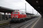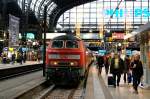 218 330-9, 218 407-5 und 8 Doppelstockwagen stehen am 31.07.2010 als RE nach Hamburg Hbf im Lübecker Hauptbahnhof zur Abfahrt bereit.