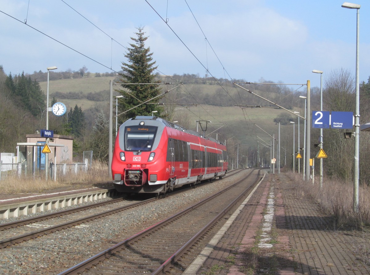 442 276-2 legt am 26. April 2015 als RB nach Saalfeld (Saale) einen kurzen Halt im Haltepunkt Marktgölitz ein.