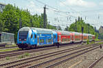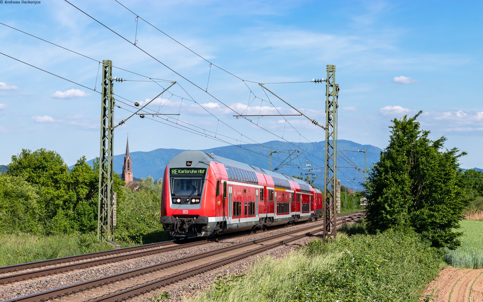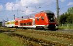 EBERSWALDE (Landkreis Barnim), 20.05.2024, RE3 nach Berlin Gesundbrunnen - mit einem Doppelstock-Steuerwagen an der Spitze - bei der Einfahrt in den Hauptbahnhof