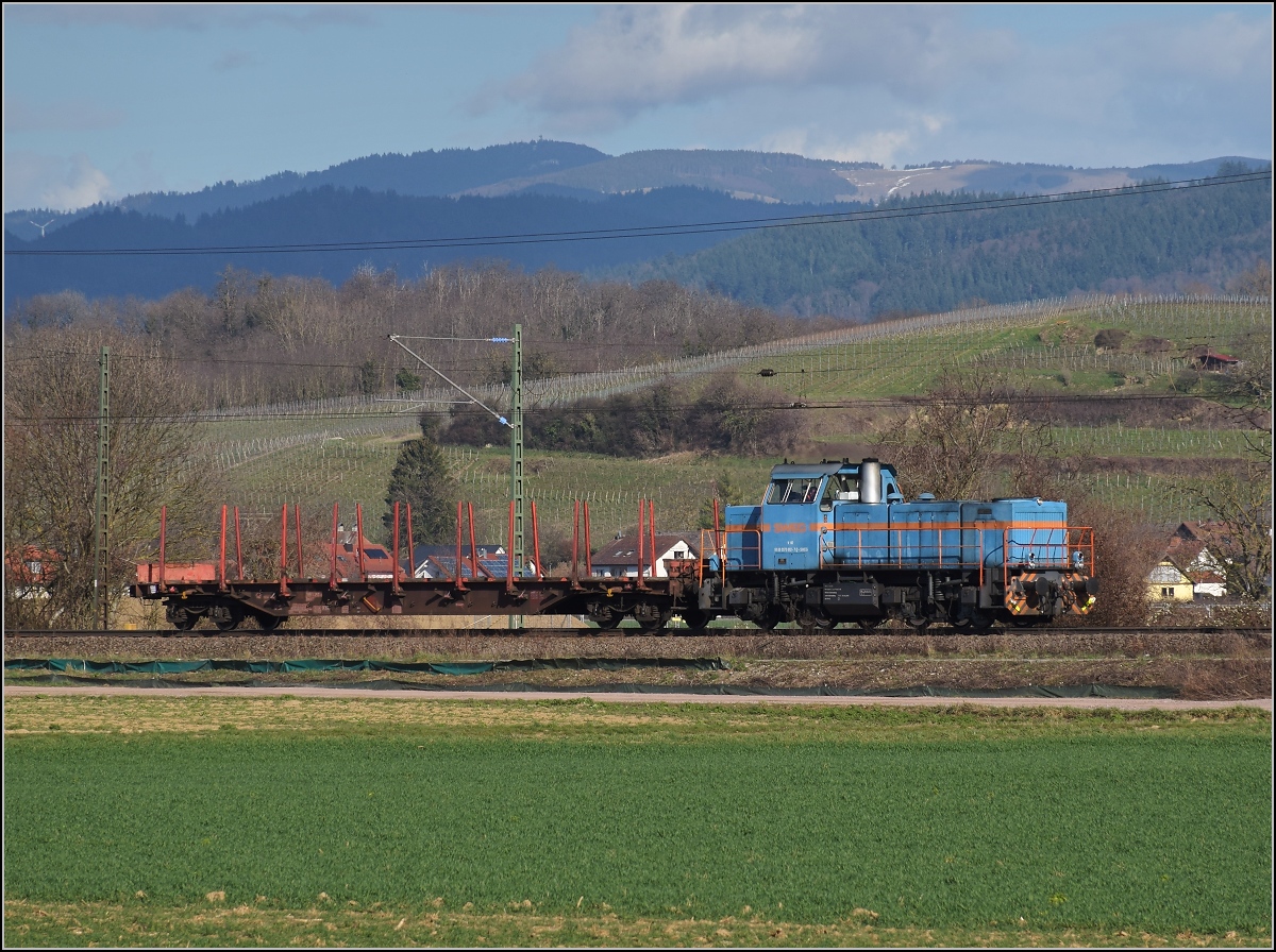 SWEG V 102 mit NVR Nummer 98 80 0 575 002-7 D-SWEG am dem Weg zum Gleisanschluss der Schwellenfabrik Richtsberg. Müllheim, März 2019.