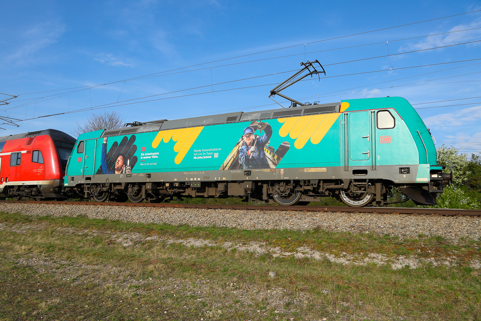 Nach dem Ende von Erkältung, kaltem Wetter und Streik hatte ich am 30. Januar 2024 endlich wieder Gelegenheit zu Eisenbahn-Fotos. Am Münchner Hauptbahnhof entdeckte ich gleich zwei neu gestaltete Lokomotiven: Die 146 247 und 146 245 der DB Regio, beide jetzt in München beheimatet. Hier hat die 146 247 die Garnitur eines RE 2 München - Regensburg - Hof übernommen. Der Zug wird erst um 13.44 Uhr München verlassen, doch zuvor erfolgt noch ein Rangiermanöver, damit die angekommene Lok vom Prellbock abrücken kann. Die 146 247 wirbt für Jobs in der Instandhaltung bei der DB.