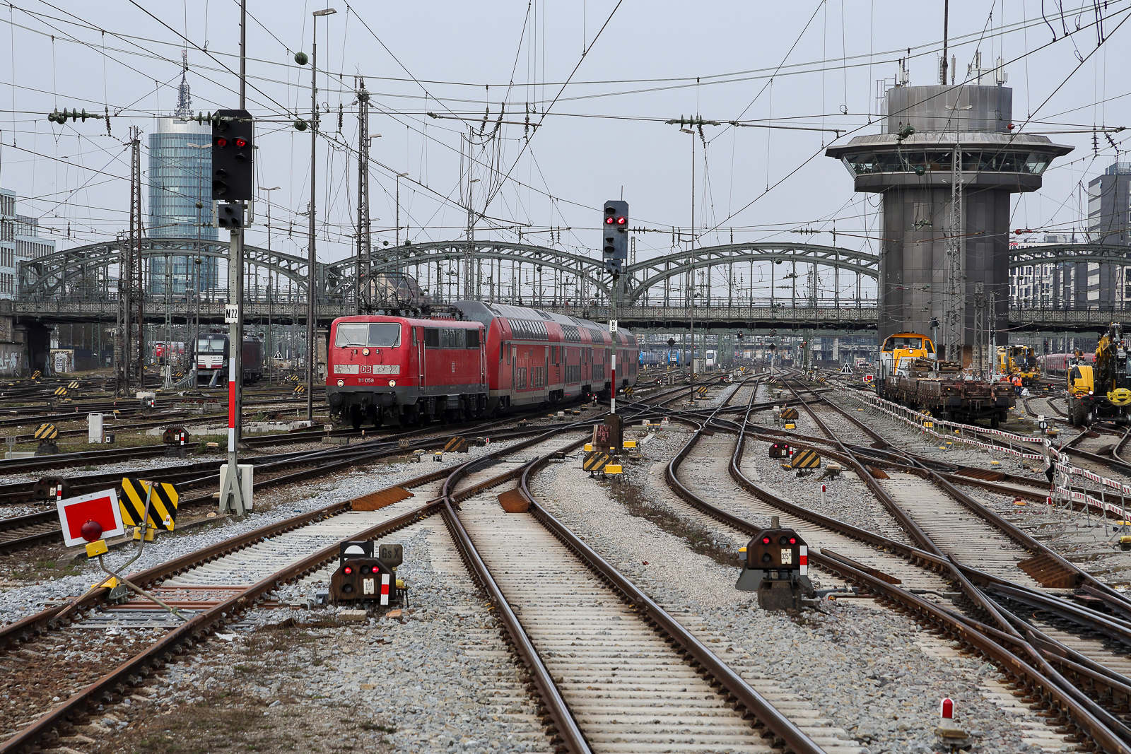 Am 05.05.09 verläßt die Arriva 183 001 den Münchner Hauptbahnhof, nachdem eine V60 ihren aus Alex- und tschechischen Wagen gebildeten Zug abgezogen hat. Warum die Lok auf der Alex Nord-Strecke die Leuchtschrift "Vogtlandbahn" zeigt, weiß ich allerdings nicht.