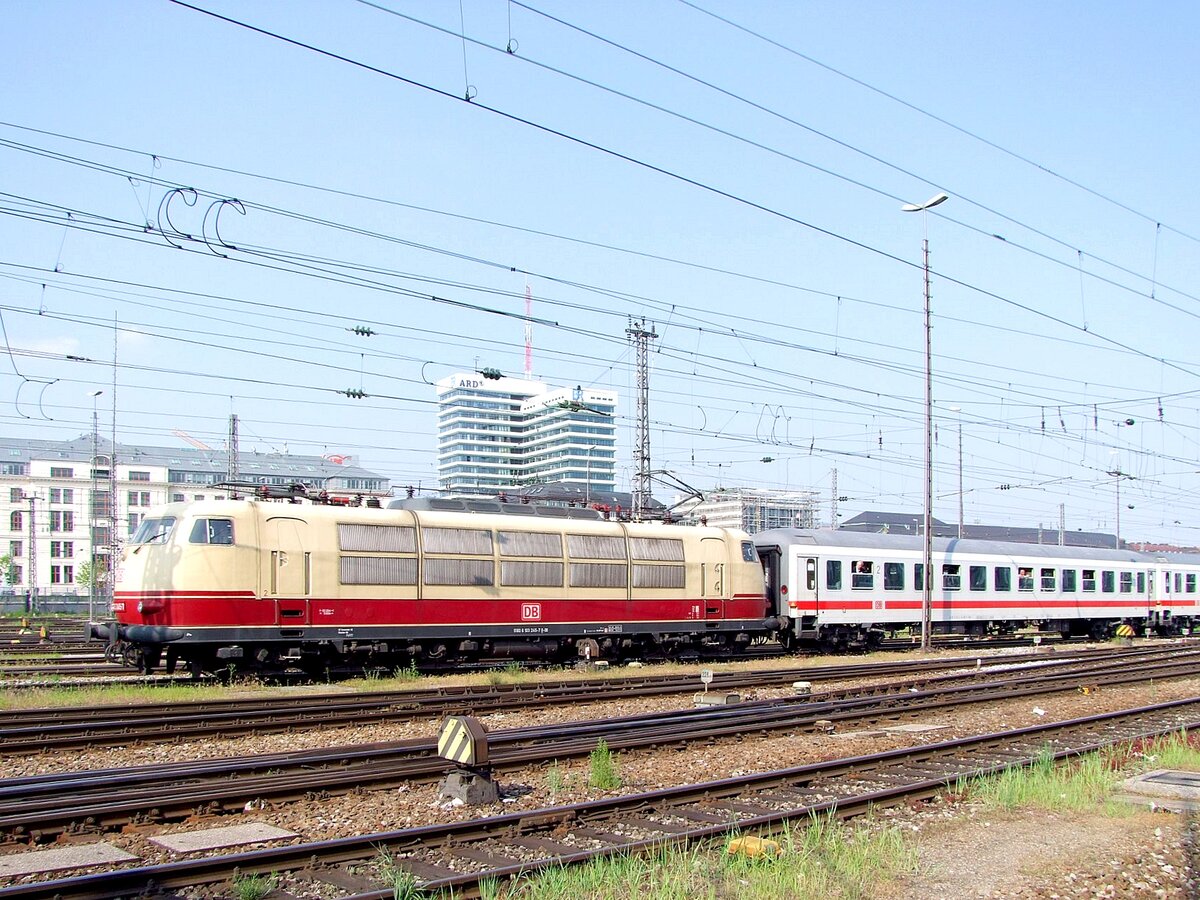 Langsam schlängelt sich der ICE 4 über Gleisbögen und Weichen hinaus aufs schneebedeckte Vorfeld des Hauptbahnhofes. Im Hintergrund ist die Hackerbrücke erkennbar.