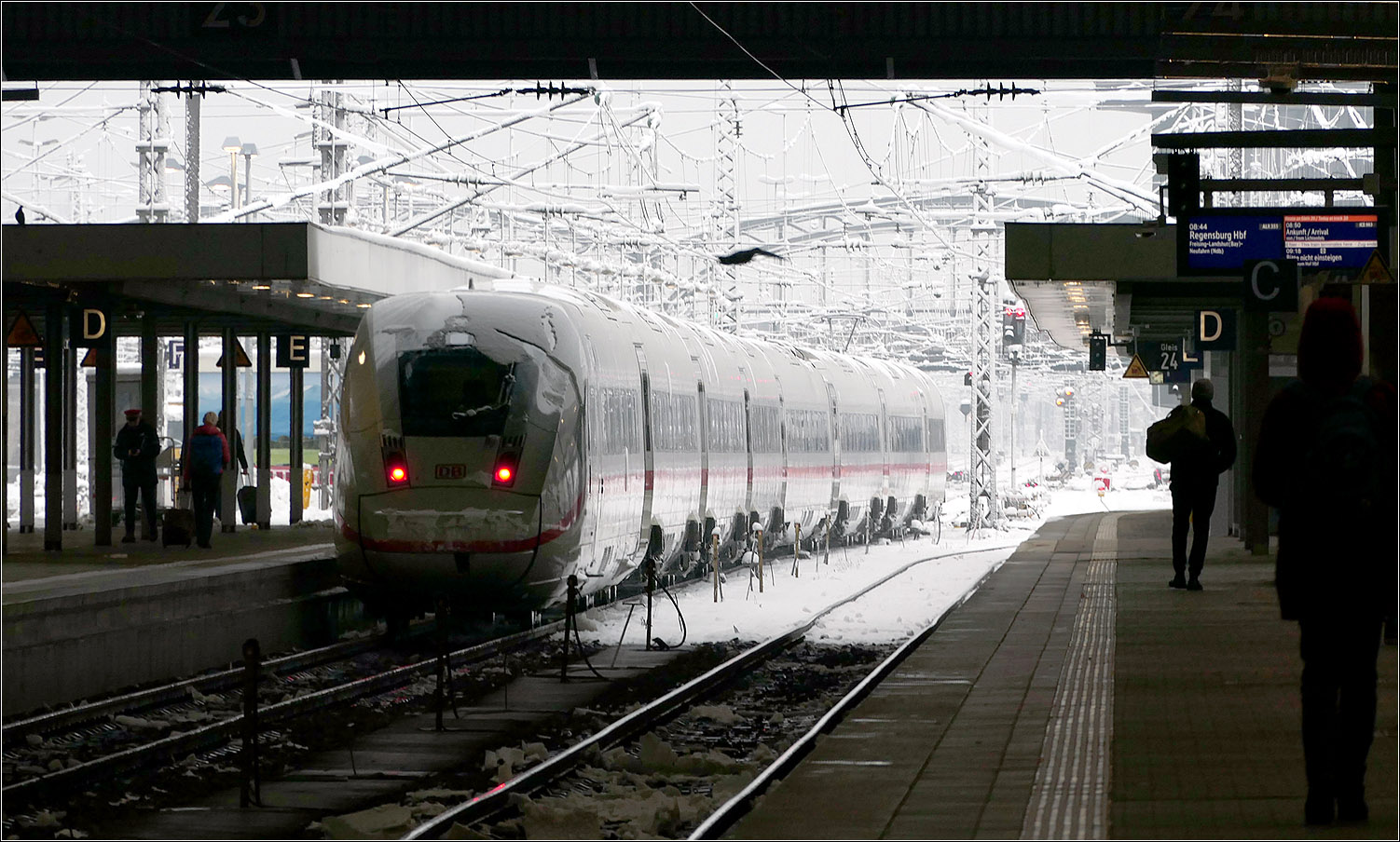 Beladen mit Schnee und Passagiere macht sich ein ICE 4 im Hauptbahnhof auf seinen Weg durch die Winterlandschaft.