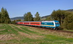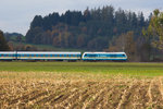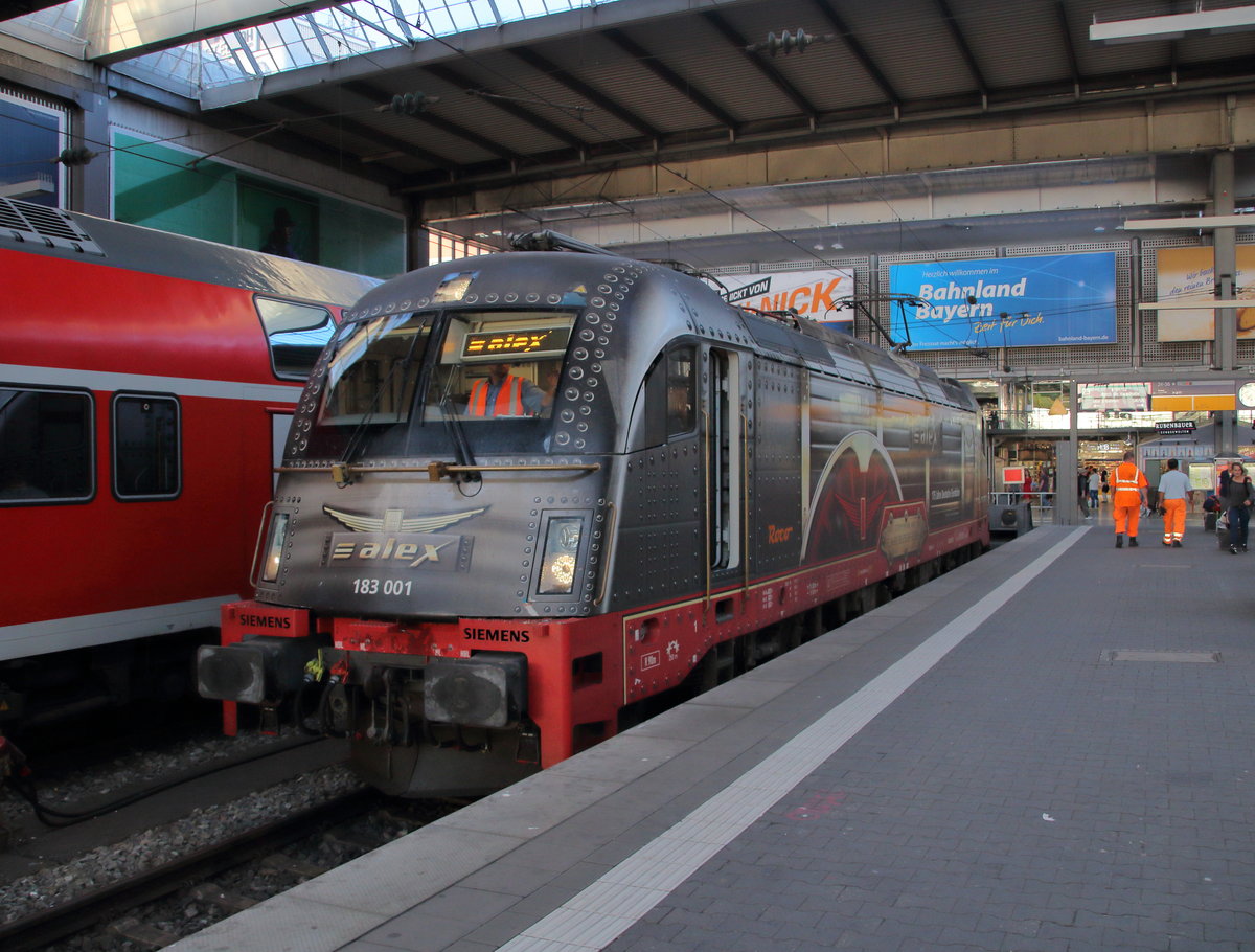 Von Regensburg bis München übernehmen Loks der Baureihe 183 (ES 64 U4) den Alex. Gerade ist 183 001 mit dem ALX 352 (Praha hl.n - München Hbf) in München angekommen. Die Lok macht aufmerksam auf das "Jubiläum 175 Jahre Deutsche Eisenbahn".