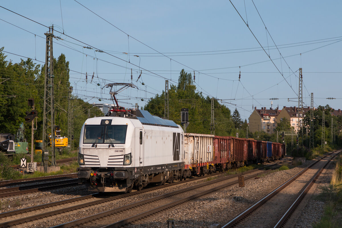 248 995-3, damals wohl für die Steiermarkbahn unterwegs, mit einem Ganzzug E-Wagen am Heimeranplatz in München. Fotografiert am 06.08.2025. Christian Geschonneck