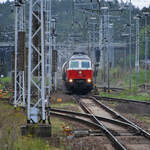 Die Elektrolokomotive 147 558 zieht einen IC2-Doppelstock-Mittelwagen, so gesehen Mitte Mai 2021 am Hauptbahnhof Neustrelitz.