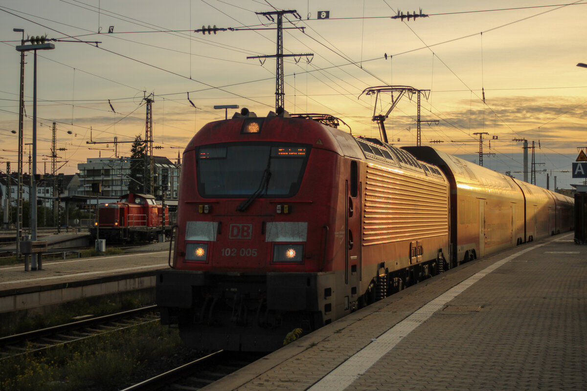 102 005 fährt mit ihrem RE 1 nach München Hbf aus dem Nürnberger Hauptbahnhof aus. Im Hintergrund ist 212 323-0 zu sehen. (03.10.2025)